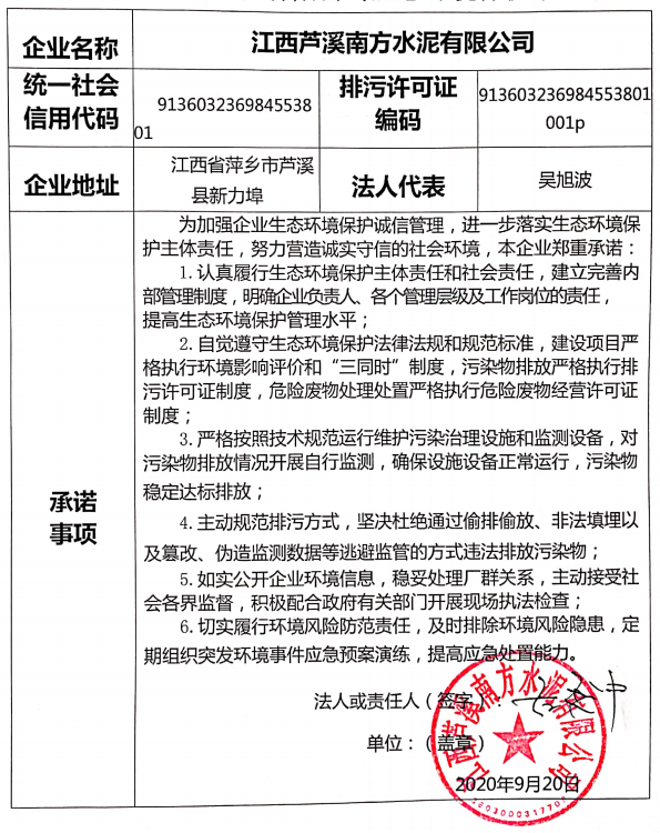 江西芦溪南方水泥有限公司生态环境保护承诺书